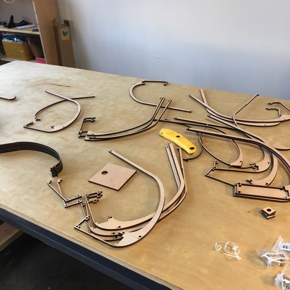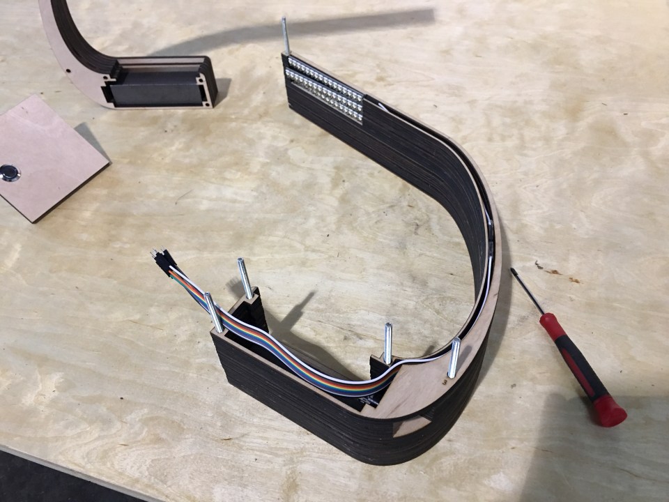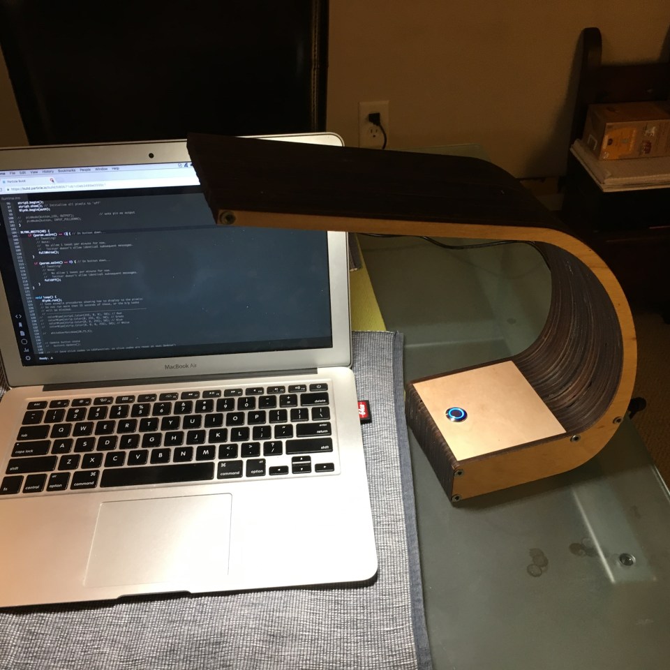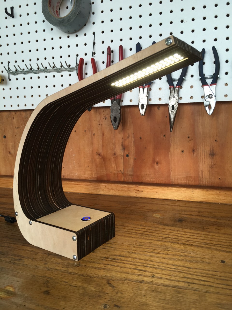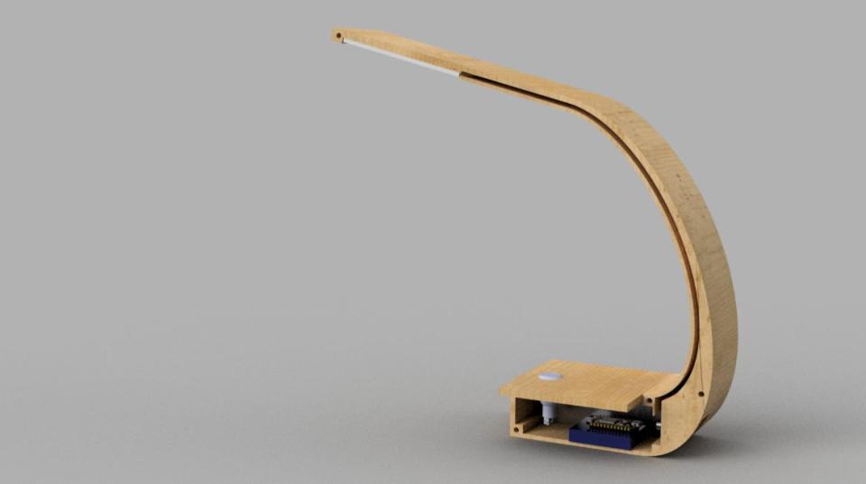For the prototype, we wanted to create a crafted and elegantly simple design and so we used wood for the body. To allow for an easily produced, accurate, and repeatable design, we chose to create the lamp out of a series of laser cut wooden panels fastened together. By fastening a series of panels together, we could hide all the electronics and cabling inside, which reinforced the simple design.